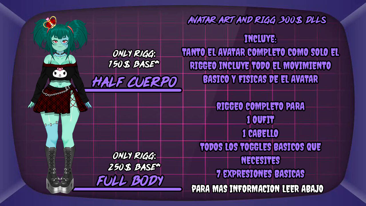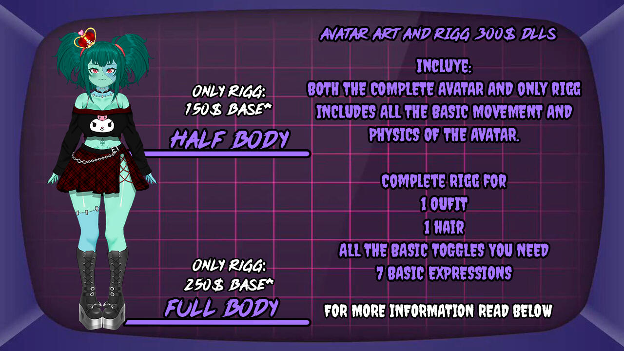 for the complete avatars (art and rigging) I work with different artists, since I only rig, so I have discounts with them to make the avatars, so we can offer a lower price for you, when ordering a complete avatar I will contact you directly with the artist of your choice first to make the art (once we agree on the final price and everything that will have the avatar).The estimated delivery time will depend on the artist how long it takes in the art plus my rigging time (approx 1 to 2 months depending on the complexity of the rigging).